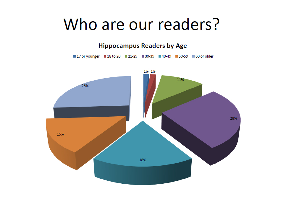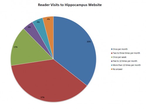 As a lit mag editor (and a marketer/PR person by trade), I was curious to know more about our audience. So between January and March 2012, Hippocampus Magazine surveyed its readers; seventy-three people responded to the anonymous survey. As promised, I’m sharing the results with our community. (view PDF of all charts here)