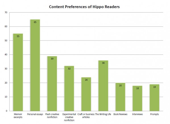 When asked what type of content readers preferred (and they could choose more than one answer), personal essays took the lead, followed by memoir excerpts. In the articles side of things, The Writing Life was the most sought-after content.