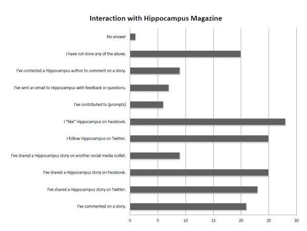 Hippocampus readers are loyal, as shown by our survey results. Of those polled, most have been visiting the site for more than six months. A monthly magazine, it is expected that the highest percentage of readers only visit once per month, so I was pleasantly surprised that 37% of readers visit between two to three times per month, followed very closely by the 36% that visit once per month. And our readers are pretty active with the magazine. Facebook interaction is most popular among readers, followed by Twitter.