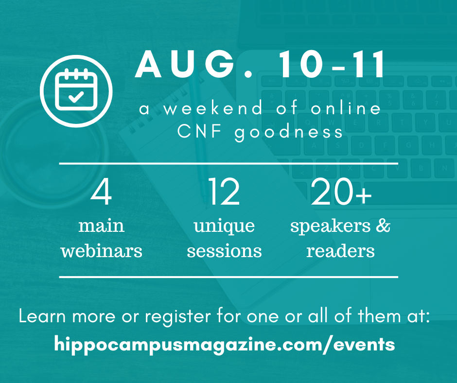 We’re thrilled to once again be hosting an online weekend of events in place of the on-hiatus HippoCamp: A Conference for Creative Nonfiction Writers. We’re dubbing this event “HippoCamp Weekend” (including the quotes) simply because it’s a name familiar to past attendees, and also because its during mid-August, when we typically held the conference in Lancaster, PA.