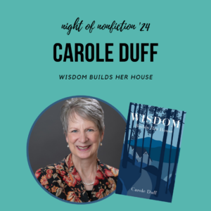 Carole Duff is a veteran teacher, flutist, naturalist, and writer of creative nonfiction. She posts weekly to her long-standing blog Notes from Vanaprastha and has written for Brevity blog, Huffington Post, Mockingbird, Please See Me, Streetlight Magazine, The Perennial Gen now The Sage Forum, for which she is a regular contributor, and other publications. Her book Wisdom Builds Her House releases August 20,, 2024. Carole lives in Virginia’s Blue Ridge Mountains with her husband, another third-stage-of-life, debut author K.A. Kenny (The Starflower), and two, large overly-friendly dogs. You can contact Carole through her website: caroleduff.com.